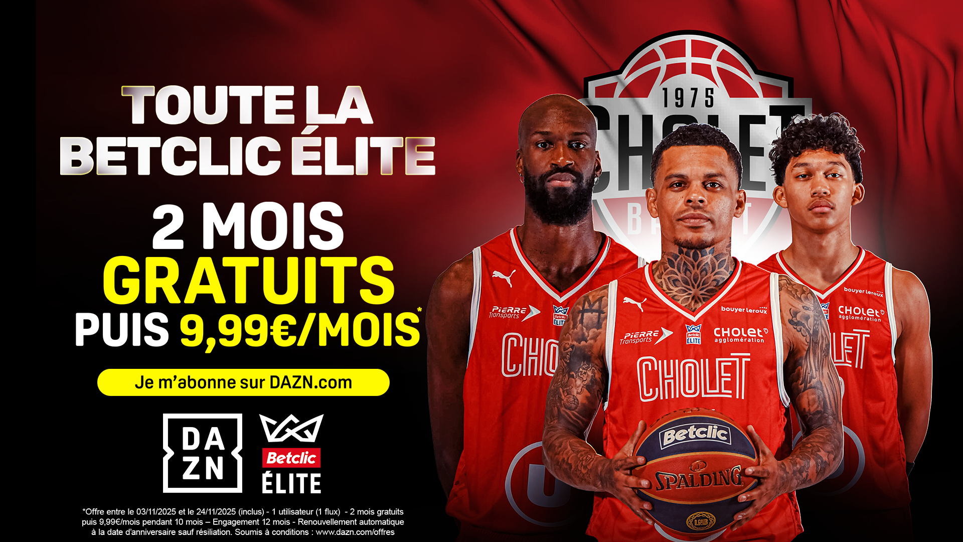 Gratuit : 2 mois sur DAZN pour suivre vos Choletais en Betclic ÉLITE. Puis 10 mois à 9,99€/mois.