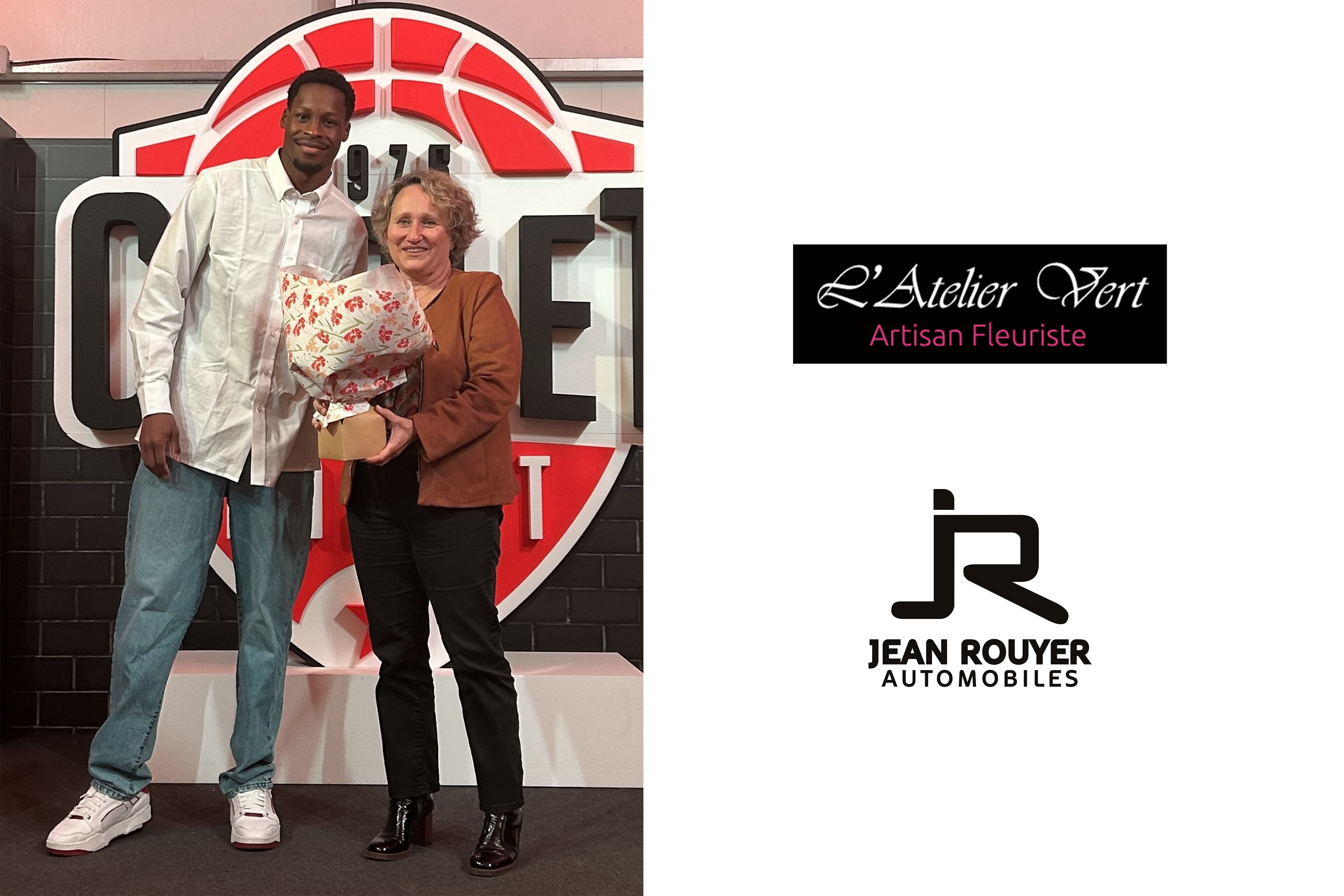 Lors de la rencontre CHOLET BASKET/CHALON SUR SAONE, la composition florale, réalisée par L'ATELIER VERT de Cholet, a été remise par Gérald AYAYI à Mme Bénédicte ROUYER, du Groupe Jean Rouyer Automobiles, parrain de la rencontre.