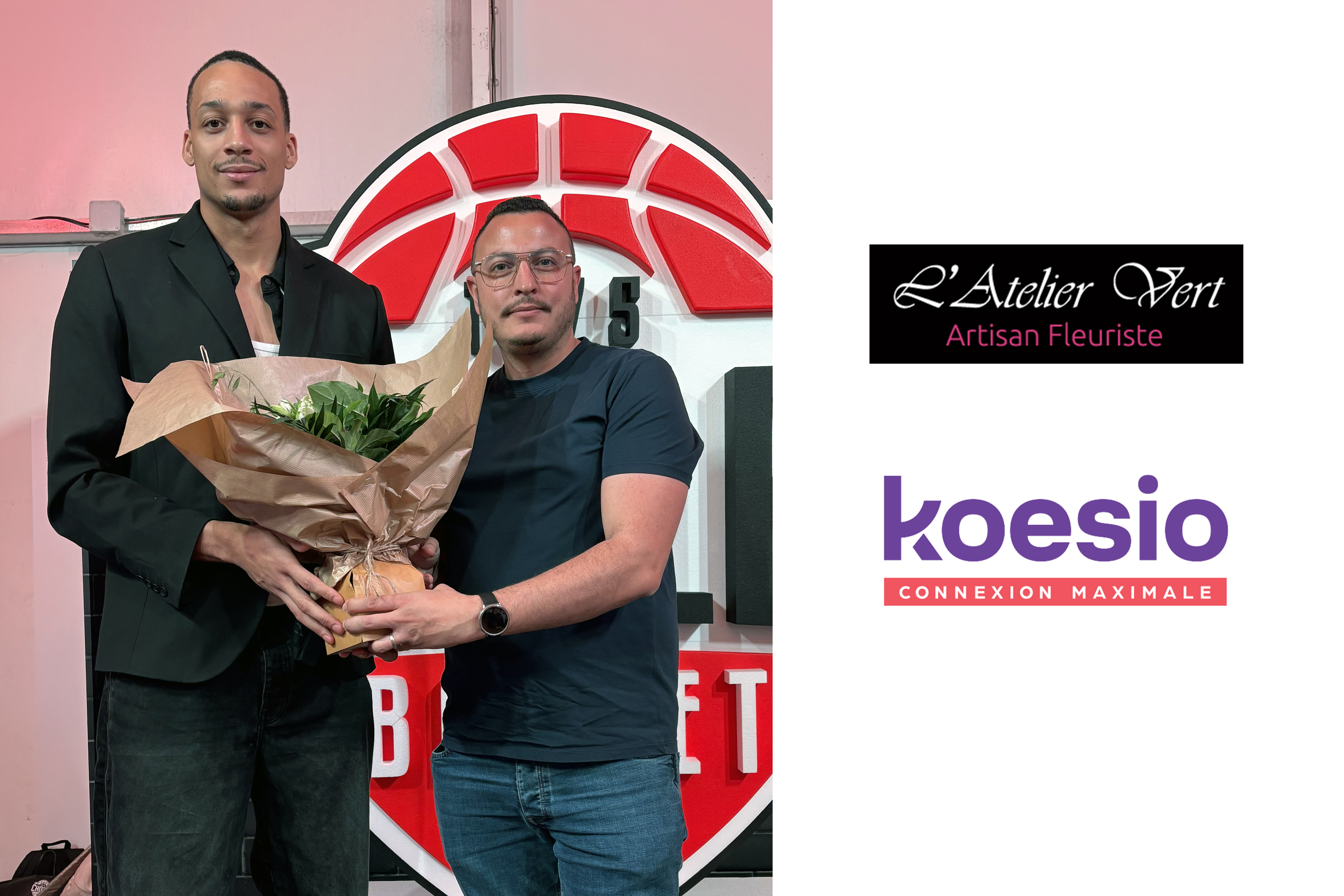Lors de la rencontre CHOLET BASKET / PARIS, la composition florale, réalisée par L'ATELIER VERT de Cholet, a été remise par Jamuni McNEACE à M. Paul FERNANDES, de la société KOESIO, Partenaire Majeur du Club.